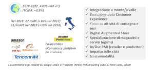 - Digital augmented store: i negozi stanno evolvendo da semplici punti vendita a touchpoint, ovvero punti di dialogo con il cliente finale. Si stanno anche trasformando in magazzini da cui le aziende evadono gli ordini e-commerce. Da ciò consegue la necessità di avere una maggior integrazione informatica tra magazzini centrali e negozi e, più in generale, una spinta verso la specializzazione di magazzini e servizi logistici.